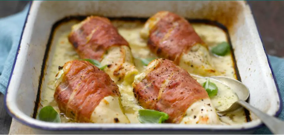 Poulet au jambon cru et au bleu WW, Un plat de poulet tout simple mais riche en goût grâce au mariage du basilic, de la fourme d’Ambert et du jambon cru.